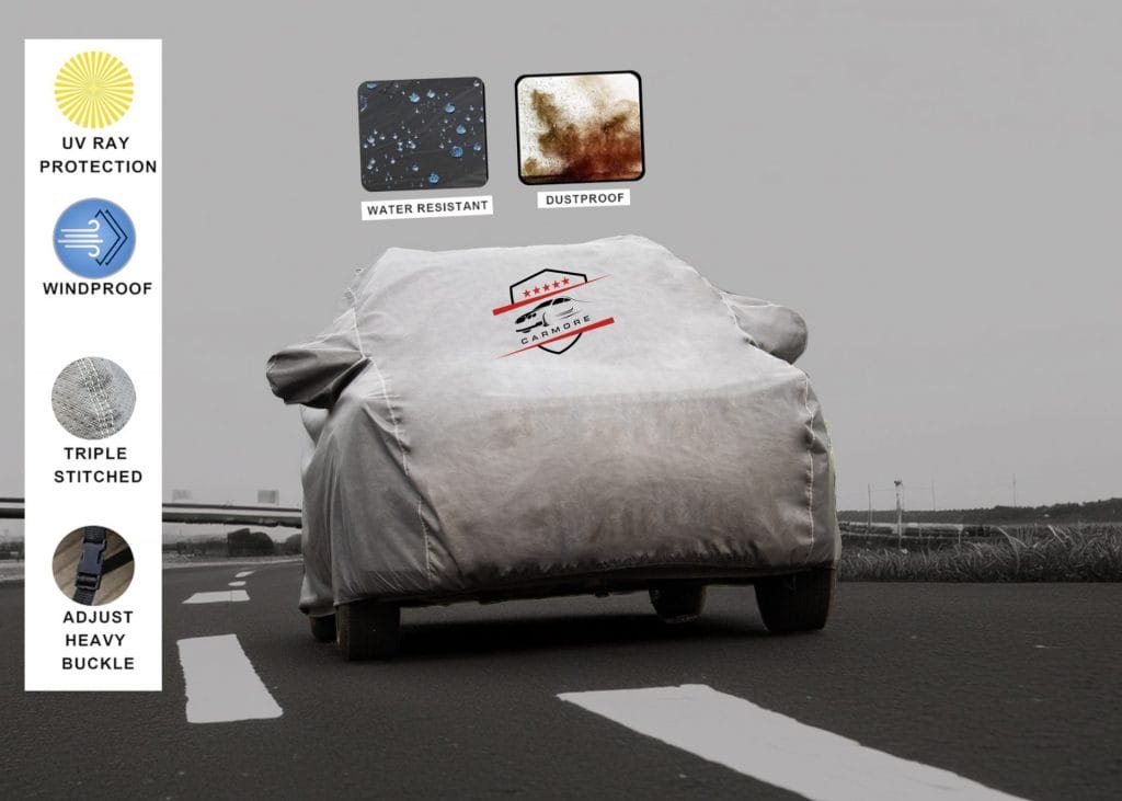 CARMORE – 3 Layer Heavy Duty Waterproof, All Weather Resistant Car Cover Compatible With Renault Kiger, Tata Punch, New Baleno, Hyundai i-20 Elite, Nissan-Magnite, Toyota-Glanza, Tata Altroz, New Swift, Polo.