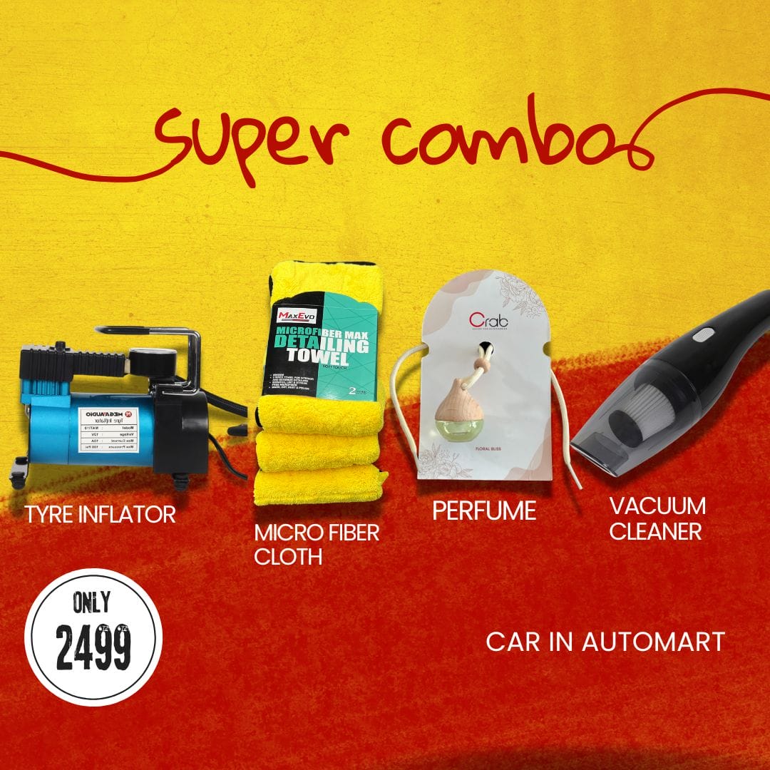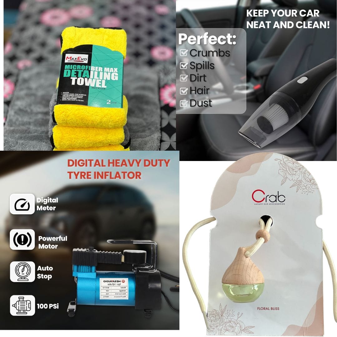 Elevate your car maintenance with our Ultimate Car Care Combo. This bundle includes essential tools and accessories to keep your car clean, fresh, and running smoothly. The combo contains a Tyre Inflator, Vacuum Cleaner, Perfume, and Microfiber Cloth. It’s everything you need to keep your vehicle in top condition.